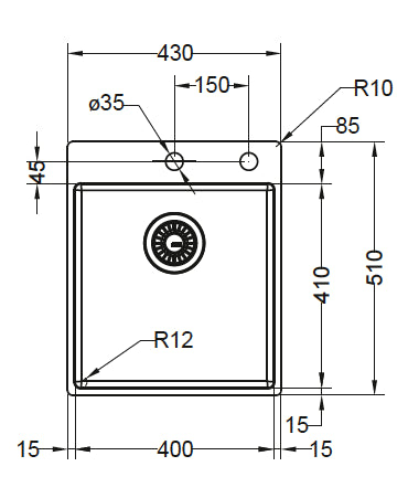 - Evier percé 35 mm pour robinetterie et commande rotative